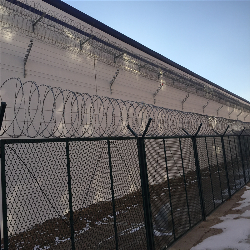 監(jiān)獄、看守所巡邏道隔離網(wǎng)上部安裝刀片刺網(wǎng)(刺絲滾籠),刀片刺網(wǎng)具有嚇阻、防翻越等效果,材質(zhì)堅(jiān)硬,高強(qiáng)度,高張力,造型設(shè)計(jì)獨(dú)特,不宜觸摸,因而能達(dá)到極好的防護(hù)隔離效果。巡邏道隔離網(wǎng)還具有施工簡(jiǎn)便,經(jīng)濟(jì)實(shí)用等優(yōu)點(diǎn)。