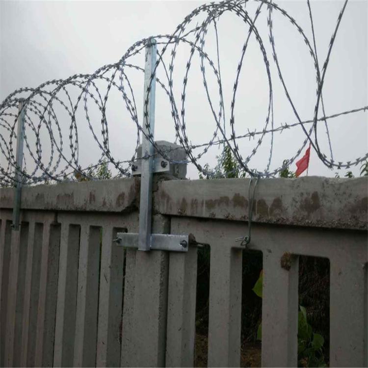 (3)、高鐵刺絲滾籠由刺絲連接卡扣與固定在支架上的縱向拉筋相連接,縱向拉筋與支架的連接采用?2.5mm的冷拔鍍鋅鋼絲繞2圈后擰緊固定,支架設(shè)置在跨度3m防護(hù)柵欄的立柱和跨中位置,其他跨度僅設(shè)置與立柱上部,支架與防護(hù)柵欄采用支架抱箍連接。