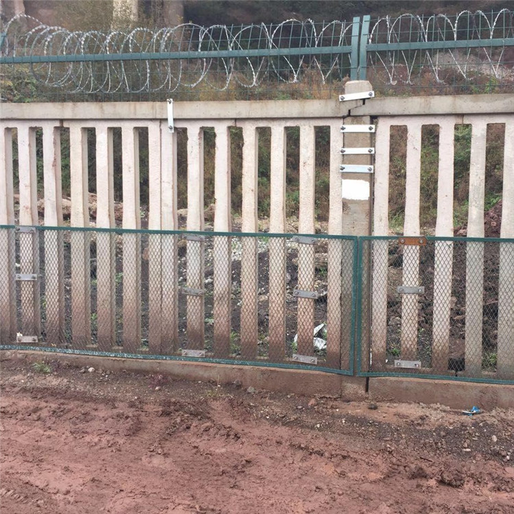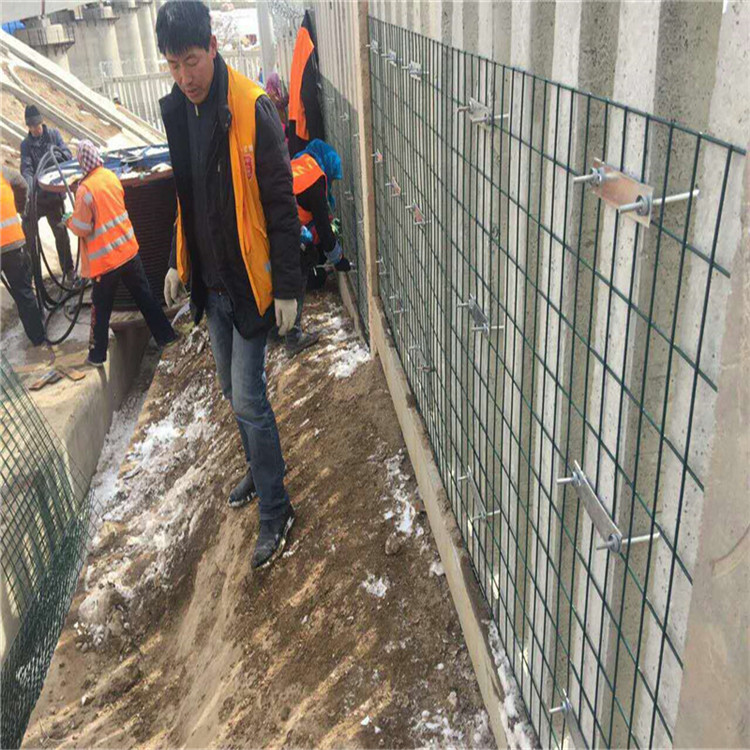 鐵路加密網(wǎng)格網(wǎng)長度根據(jù)防護(hù)柵欄單元長度確定,編織鋼采用熱鍍處理。直為2.2mm,鐵路加密網(wǎng)又叫格柵網(wǎng),四周采用扁鋼焊接加固,扁鋼為3mmX14m,格網(wǎng)應(yīng)進(jìn)行浸塑處理,格網(wǎng)設(shè)于柵欄內(nèi)側(cè)(靠近鐵路側(cè)),采用U型螺把加密網(wǎng)捆于欄欄片上,U型寬、長應(yīng)根據(jù)欄片截面尺寸而定,一般總長380mm,螺母于欄內(nèi)側(cè)。整個(gè)連接構(gòu)件表面做防腐處理。格柵網(wǎng)底部應(yīng)與下檻頂面密貼,兩端部應(yīng)與立柱側(cè)面密貼。