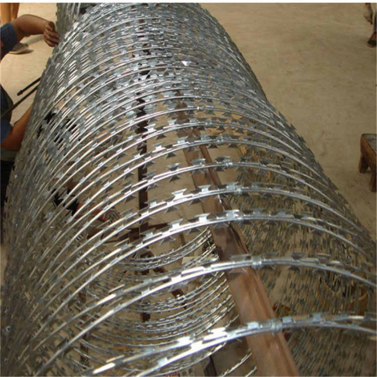 工程案例普通的圍墻經(jīng)常會(huì)有人或動(dòng)物翻越的危險(xiǎn),所以在安全防御方面,就應(yīng)生了刀刺網(wǎng)這種產(chǎn)品,南方人喜歡叫刺絲滾籠,北方人喜歡叫刀刺網(wǎng),也有很多其他叫法,如:蛇腹形(型)刀刺網(wǎng) 滾刀刺,刺刀圈,那它有很多種型號(hào),常用的就是BTO-22刀刺網(wǎng),材質(zhì):熱浸鋅和不銹鋼,型號(hào):BTO-22,芯線:常用2.5mm,厚度:0.5mm,刀片長度:22mm*15mm,刀片間距:34mm。直徑300-1000mm,常用的是500mm的。如果是陰雨多的地方建議選擇不銹鋼刀刺網(wǎng)材質(zhì),其他地方熱浸鋅的就可以。刀刺網(wǎng)安裝在圍墻上通常搭配支架來安裝固定,每3米設(shè)置一個(gè)支架,由刺絲連接卡扣與固定在支架上的縱向拉筋相連接,縱向拉筋與支架的連接采用?2.5mm的冷拔鍍鋅鋼絲繞2圈后擰緊固定,支架底盤用膨脹螺絲固定在圍墻上就可以了。刺刀圈廣泛用于軍事重地、監(jiān)獄、政府機(jī)關(guān)、銀行,以及生活小區(qū)圍墻、私人住宅、別墅的圍墻、門窗、高速公路、鐵路護(hù)欄以及邊境線等用來防護(hù)保安。