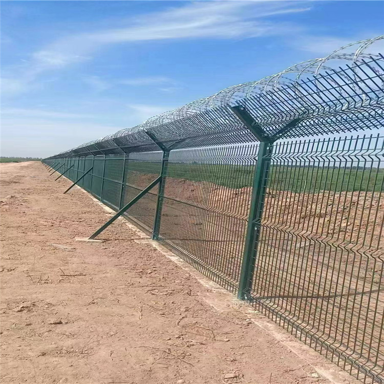 機(jī)場(chǎng)護(hù)欄網(wǎng)是專(zhuān)為機(jī)場(chǎng)設(shè)計(jì)的新型圍界產(chǎn)品,采用高強(qiáng)度低碳鋼絲強(qiáng)力焊接,立柱為矩形鋼及高強(qiáng)度圓管,頂部加焊V型支架,大大增強(qiáng)了圍網(wǎng)的抗沖擊力,頂部在增加刀片刀刺絲后又很快的增強(qiáng)了安全防護(hù)性能。機(jī)場(chǎng)護(hù)欄網(wǎng)對(duì)保障飛機(jī)器免受非法干擾,確保運(yùn)行安全起著非常重要的作用。由于機(jī)場(chǎng)周界控制長(zhǎng)度從近十公里到幾十公里,并受氣候、天氣、地理環(huán)境等影響非常明顯,這些對(duì)圍界安防設(shè)施的安全防范作用的有效發(fā)揮都提出了較大的挑戰(zhàn)。首先帶大家來(lái)了解機(jī)場(chǎng)護(hù)欄網(wǎng)的主要規(guī)格:整體高度2.5米,寬度3米,立柱采用60×60方管或圓管,網(wǎng)片采用4.0-6.0mm低碳鋼絲焊接,網(wǎng)孔一般為50×100mm,50×200mm及60×120mm等,這些關(guān)鍵的數(shù)據(jù)對(duì)機(jī)場(chǎng)護(hù)欄網(wǎng)的使用年限起到了決定性的作用。