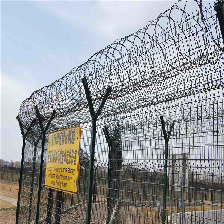 關(guān)于機(jī)場(chǎng)鋼筋網(wǎng)圍界的概述,本產(chǎn)品采用優(yōu)質(zhì)低碳鋼或者是鋁包鋼編焊而成。立柱多采用金屬管,材料的選取應(yīng)考慮景觀協(xié)調(diào)性、與網(wǎng)片或網(wǎng)絲的配合、施工難易程度、防腐等因素,力求做到因地制宜。處理一般采用鍍鋅+噴塑的雙層防腐處理方式。也有部分地區(qū)為增加抗腐蝕性而采用鍍鋅+浸塑的防腐處理方式,用V型支架立拄,加強(qiáng)型焊接片網(wǎng),安全防盜連接件和熱鍍鋅刀片刺籠組成強(qiáng)度和安全防御性級(jí)別高,使用年限可達(dá)10年。