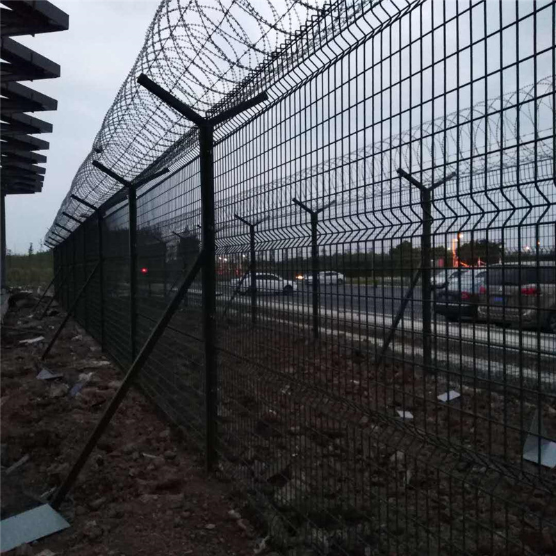 機(jī)場護(hù)欄網(wǎng)安裝蛇腹式刀刺網(wǎng),立柱項(xiàng)部的V型直接兩個(gè)側(cè)臂焊接有專用的刺網(wǎng)勾,每個(gè)側(cè)架設(shè)三道熱鍍鋅鋼絲,形成一個(gè)V型槽 ,然后把刀刺網(wǎng)放到上面,再用配套卡扣把鋼絲和刀刺網(wǎng)連接到一起,如果V型架內(nèi)安裝V型網(wǎng)架,安裝就更簡單了, 直接把刀刺網(wǎng)連接到V型網(wǎng)上面就可以了, 這樣就完成了機(jī)場護(hù)欄網(wǎng)的安裝。