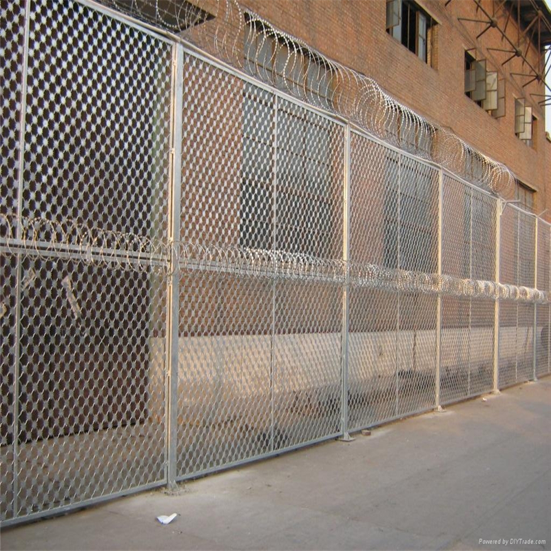 監(jiān)獄物理隔離網(wǎng)廠家 監(jiān)獄物理隔離網(wǎng)是非常重要的監(jiān)獄安全防護(hù)設(shè)施,由焊接鋼網(wǎng)加蛇腹形刀刺網(wǎng)組合而成。主要是采用低碳鋼絲焊接或者是編織成的小孔網(wǎng)片,頂部加上防爬的螺旋滾刺網(wǎng),由V型支架立拄,加強(qiáng)型焊接片網(wǎng),安全防盜連接件和刀片刺網(wǎng)組成,既安全環(huán)保又經(jīng)久耐用。監(jiān)獄防攀爬隔離網(wǎng),監(jiān)獄隔離網(wǎng),監(jiān)獄網(wǎng)圍墻立柱焊接成Y型,表面浸塑處理,網(wǎng)片高度2000mm-3000mm,長(zhǎng)度2500mm-3000mm,V型頂端安裝刀片刺網(wǎng),直徑采用50cm-60cm,刀片刺網(wǎng)主要是由熱鍍鋅鋼板或不銹鋼薄板沖壓而成的,它擁有尖銳的刀片,高張力鍍鋅鋼絲或者不銹鋼絲做芯線組合而成的產(chǎn)品。監(jiān)獄護(hù)欄網(wǎng)網(wǎng)格結(jié)構(gòu)簡(jiǎn)練、便于運(yùn)輸、安裝不受地形起伏限制,特別是對(duì)于山地、坡地、多彎地帶適應(yīng)性極強(qiáng)。