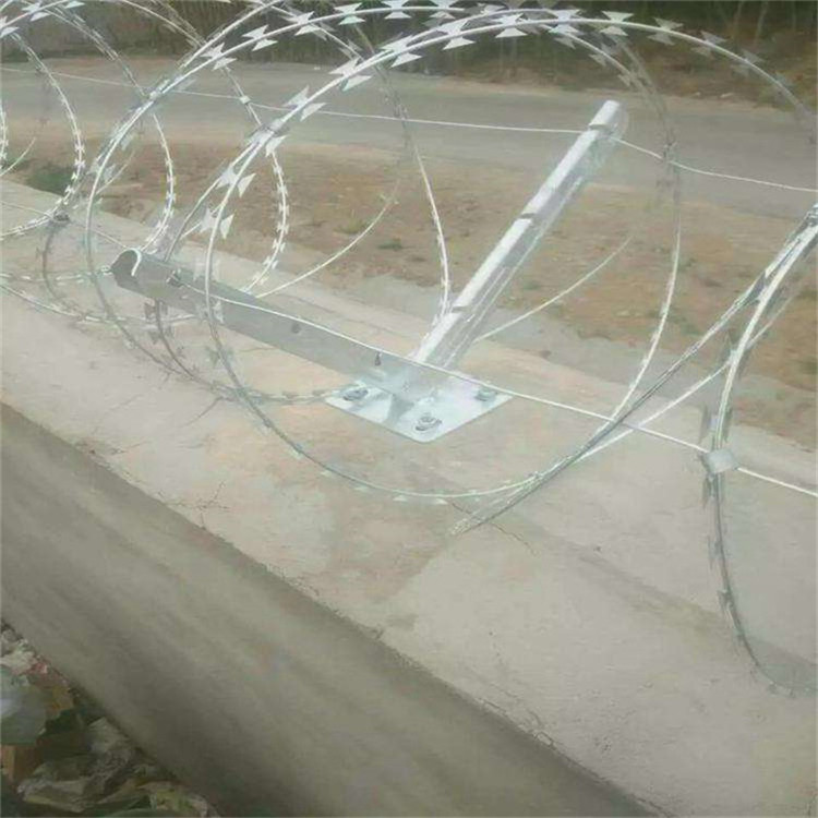 第二種,在刀刺網(wǎng)安裝的過程中,可根據(jù)圍墻的長度設計需要使用多少根Y字支架,一般以5-10cm的間距為好,把Y字型支架固定在圍墻上面,其中Y字形支架可根據(jù)您的實際情況進行打孔,以此為了安裝刀刺網(wǎng)的時候起到固定的作用。然后刀刺網(wǎng)的Y字支架上兩邊各拉一根鋼絲,對刀刺網(wǎng)加以固定,以免左右搖晃。