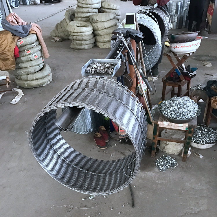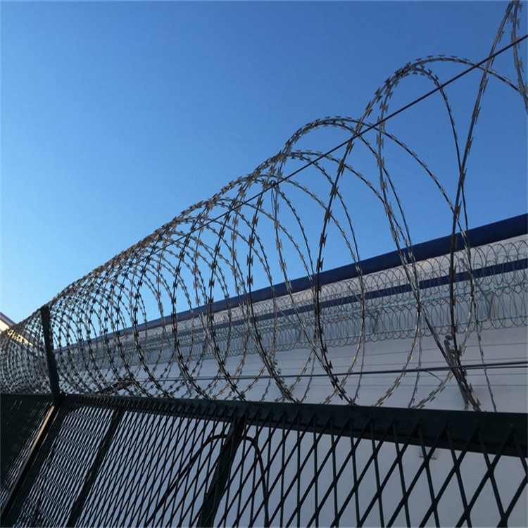Y型架上邊架蛇腹型刀刺網(wǎng):由熱鍍鋅鋼板或不銹鋼薄板沖壓出尖利的刀片狀,高張力鍍鋅鋼絲或者不銹鋼絲做芯線組合而成的阻盡器材。刀刺直徑采取50或60厘米,刀型整潔、刀片鋒利排列均勻致密、連接堅固、防腐才能強,可能達(dá)到防擎越、防拆卸更高保險等級。監(jiān)獄鋼網(wǎng)墻如何選擇刀刺網(wǎng)呢?