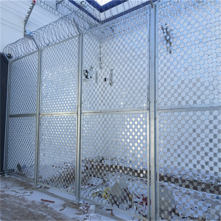 監(jiān)獄梅花刺網鋼網墻是非常重要的監(jiān)區(qū)安全防護設施,是由焊接鋼網加蛇腹形刀刺網組合而成。產品具有結構新穎、堅固緊密、網面平整、網孔均勻、刀鋒銳利、防攀爬、耐腐蝕性強等特點。Y型架上邊架蛇腹型刀刺:由熱鍍鋅鋼板或不銹鋼薄板沖壓出尖利的刀片狀,高張力鍍鋅鋼絲或者不銹鋼絲做芯線組合而成的阻盡器材。刀刺直徑采取50或60厘米,刀型整潔、刀片鋒利排列均勻致密、連接堅固、防腐才能強,可能達到防擎越、防拆卸更高保險等級。
