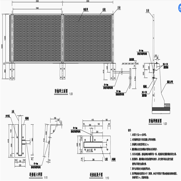 3、防拋網(wǎng)連接板與螺栓:立柱連接板,螺母及墊圈表面求熱浸鋅處理。