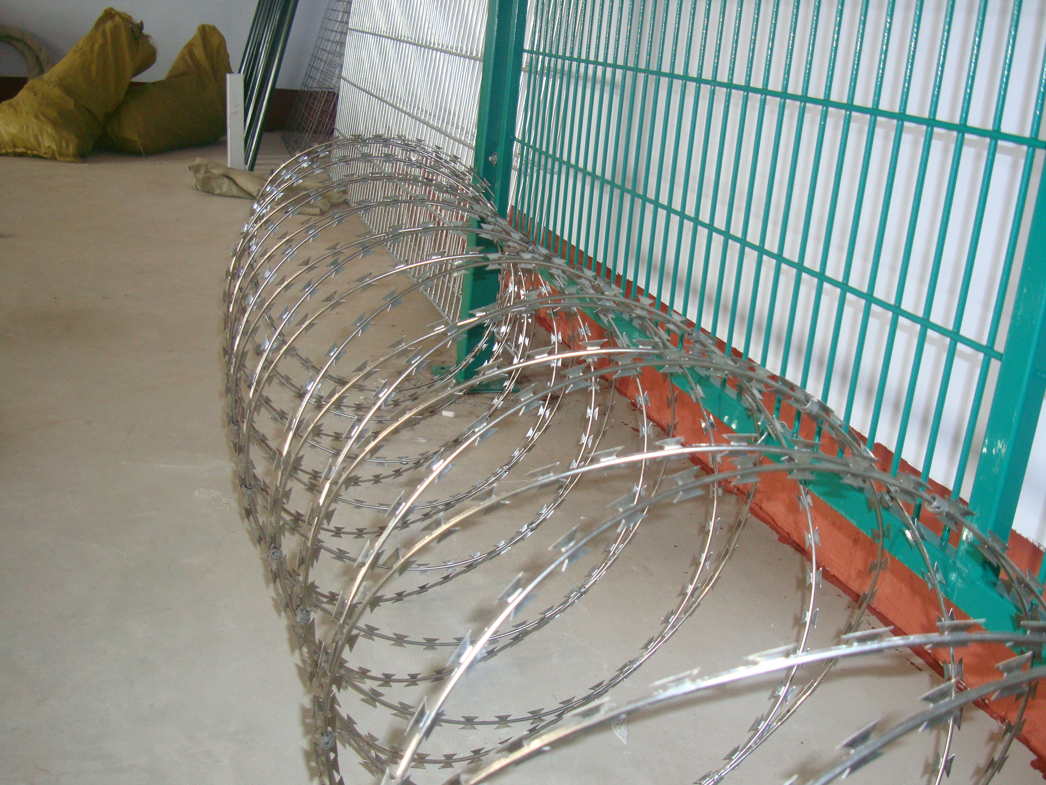 螺旋式刀片刺網(wǎng) 雙螺旋刀刺圈網(wǎng),是一種新型防護網(wǎng)。刀片刺繩具有美觀、經(jīng)濟實用、防阻效果好、施工便利等優(yōu)異特點,目前,刀片刺繩已被廣泛應(yīng)用于許多國家的工礦企業(yè),園林公寓,邊防哨所,軍事領(lǐng)域,監(jiān)獄,看守所,政府建筑物和其他國家的安全設(shè)施。