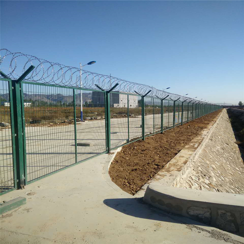 特點:如果在機場圍界頂部加裝刀片刺絲、刀片刺繩后又很好的增強了安全防護性能。采用電鍍、熱鍍、噴塑、浸塑等防腐形式,具有很好的抗老化、抗曬、耐候等特點。其產(chǎn)品造型美觀、花色多樣,既起到圍欄作用,又起到美化作用。由于具有安全性高、防攀爬能力好,網(wǎng)片連接方式采用特制SBS緊扣件,有效防止人為的破壞性拆卸,橫向四道折彎加強筋,使網(wǎng)面強度顯著增加。