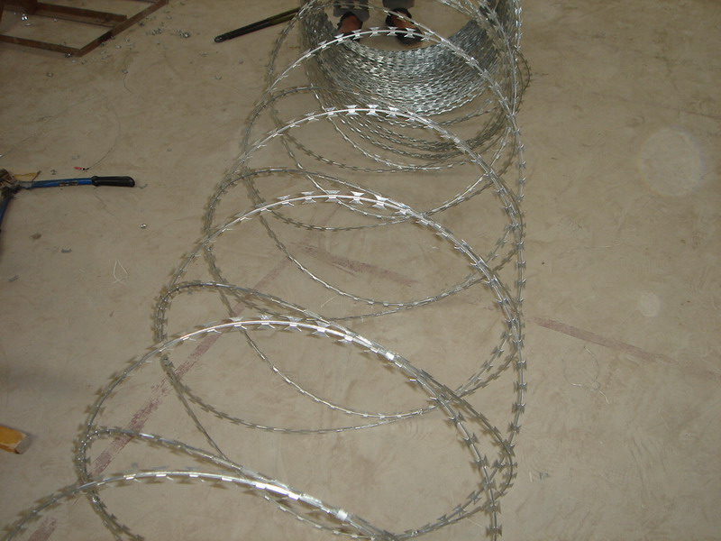 圍墻加高倒刺網(wǎng)又名刀片刺網(wǎng)或刮刀型刺網(wǎng),是一種近年來防護、隔離能力較強的新型產(chǎn)品。刀片刺網(wǎng)用及耐腐蝕性的熱鍍鋅鋼板或不銹鋼板做材料,由專用機械強力包附與熱鍍鋅高碳鋼絲或不銹鋼絲做的芯線上。圍墻倒刺網(wǎng)由于有著鋒利美觀的刀片刺、高強度的芯線,使本產(chǎn)品綜合了防阻效果好、難破壞、安裝美觀方便快捷、耐老化等諸多優(yōu)點。