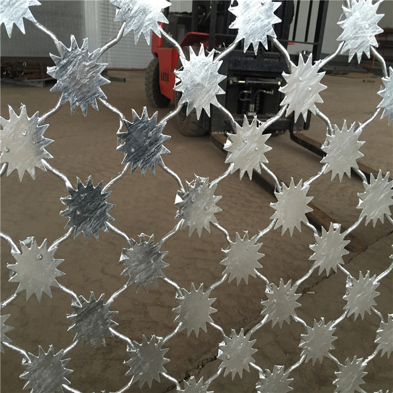 太陽(yáng)花刺片監(jiān)獄護(hù)欄網(wǎng) 網(wǎng)片、立柱要求整體熱鍍鋅,上鋅量不低于0克,可做霧化試驗(yàn)(附檢測(cè)報(bào)告),護(hù)欄網(wǎng)整體鍍鋅在內(nèi)陸自然環(huán)境下,鋅層要求使用不低于10年。