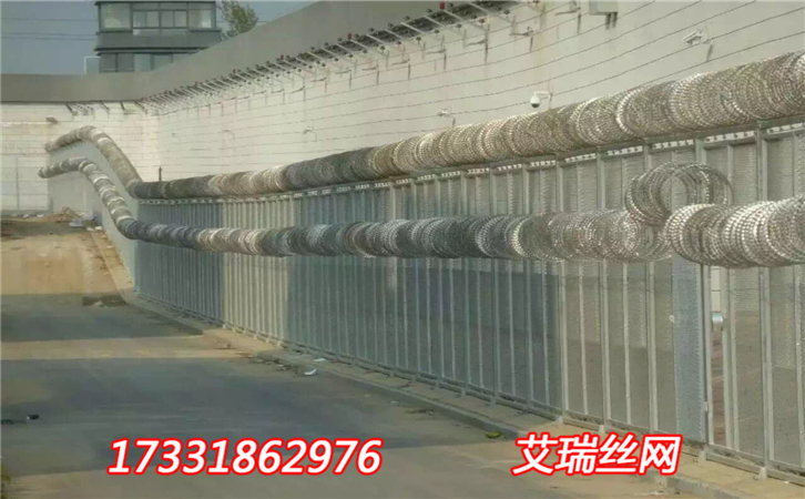 監(jiān)獄鋼網(wǎng)墻是一種新型防護(hù)網(wǎng),由銳利尖角鍍鋅鋼板或不銹鋼薄板做刀片,鋼絲做芯線組合而成的防護(hù)器材. 監(jiān)獄鋼網(wǎng)墻刀片刺網(wǎng)具有嚇阻、防翻越等效果,材質(zhì)堅硬,高強(qiáng)度,高張力,造型設(shè)計獨(dú)特,不宜觸摸,因而能達(dá)到極好的防護(hù)隔離效果.