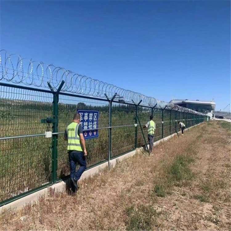工程案例機(jī)場(chǎng)鋼筋網(wǎng)圍界常用的兩種結(jié)構(gòu)有雙邊的和框架的,機(jī)場(chǎng)鋼筋網(wǎng)圍界是一種高安全隔離防護(hù)網(wǎng),這種新型隔離網(wǎng)一般由鋼筋焊接網(wǎng)、Y型防護(hù)立柱以及蛇腹式刀刺網(wǎng)等幾大主體組成。既有良好的通透性,又能起到強(qiáng)有力的安全隔離防護(hù)效果。頂部加裝刀刺網(wǎng),鋒利的刀型,有效制止的攀爬行為,強(qiáng)有力的發(fā)揮著保護(hù)機(jī)場(chǎng)作用。