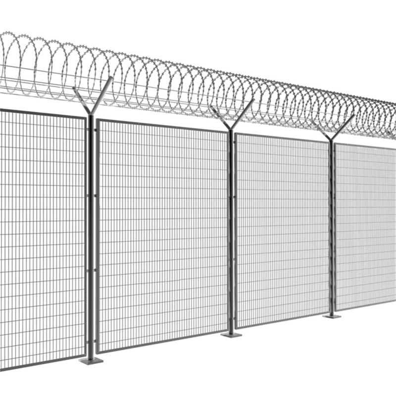 監(jiān)獄使用的防護網(wǎng)是防護性較高的護欄網(wǎng),主要是采用高強度的刀片刺網(wǎng)與普通防護網(wǎng)的結(jié)合,由V型支架立拄、加強型焊接片網(wǎng)、安全防盜連接件和刀片刺網(wǎng)組成。其中刀片刺網(wǎng)是一種新型防護網(wǎng),由銳利尖角鍍鋅鋼板或不銹鋼薄板做刀片,鋼絲做芯線組合而成的防護器材。