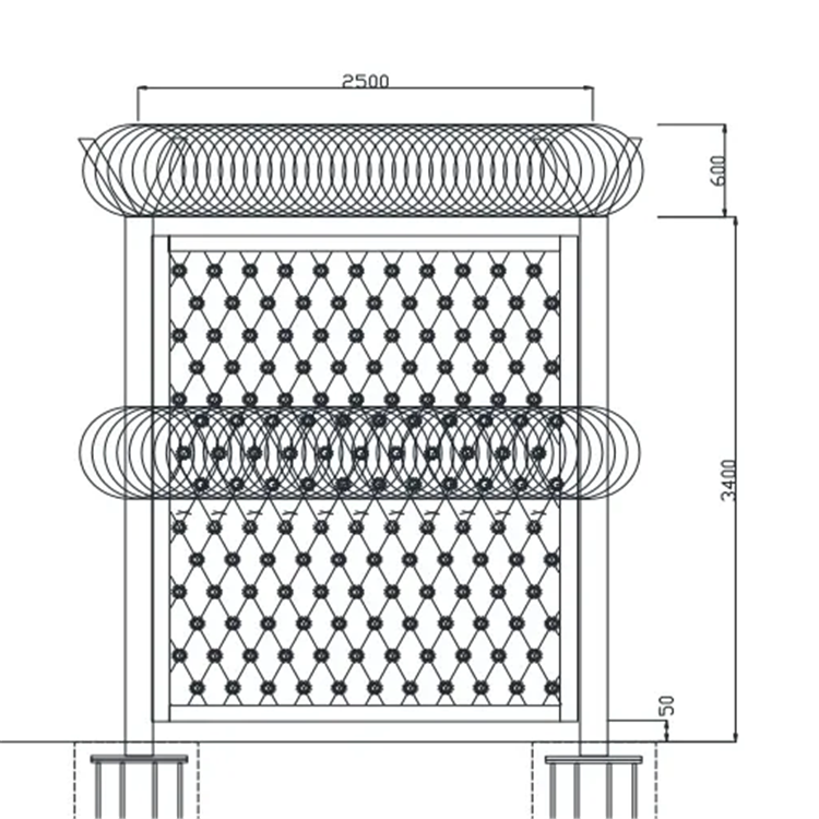 梅花刺片隔離網(wǎng)是由美格網(wǎng)加焊梅花刺片(因其外形類似梅花得名)組合而成的阻絕器材,又叫太陽花刺片鋼網(wǎng)墻。由于梅花刺片隔離網(wǎng)造形獨(dú)特不易觸摸,因而能達(dá)到很好的防護(hù)隔離效果,既美觀又讓人不寒而粟,起到了很好的阻嚇作用。頂部加蛇腹型刀刺網(wǎng),可以用304不銹鋼材質(zhì),雙重防護(hù),可以有效防止非法分子翻越攀爬。美格網(wǎng)的網(wǎng)孔般為:100x100mm,110*110mm,絲徑為:5—8mm,刺片直徑75mm,形狀似太陽,四周布滿刺尖。焊接在美格網(wǎng)每一個(gè)交接點(diǎn)處,是由二氧化碳保護(hù)焊進(jìn)行焊接的。下圖為梅花刺片隔離網(wǎng)圖紙參考:高度3400mm*立柱中心距2500mm*厚3.0mm,按圖制作,上裝600mm圈徑的304不繡鋼滾刺網(wǎng)。邊框?yàn)?0×50mm方管或50*5mm角鋼,然后把焊接打磨好的邊框與網(wǎng)片連接。